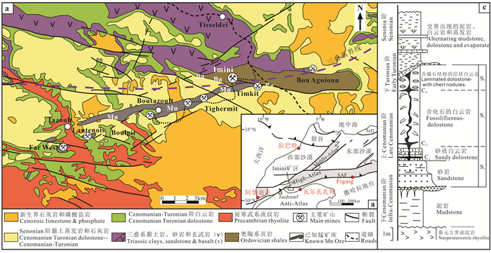 伊米尼(Imini)锰矿带位于瓦尔扎扎特(Quarzazate)前陆盆地的西部,处于北部的中—高阿特拉斯(Middie-High Atlas)山脉和南部的安迪—阿特拉斯(Anti-Atlas)山脉两个主要构造域之间的过渡带内(图 8a),下中生界地层向北增厚并在安迪阿特拉斯(Anti-Atlas)上形成沉积楔(图 8b;Zouhri et al., 2008),上三叠统红层沿N70~80°E方向展布(图 8b中的紫色虚线)。锰矿体赋存在上白垩统的森诺曼—土仑(Cenomanian-Turonian)阶浅海碳酸盐岩地层中(图 8b、c;Thein, 1990;Gutzmer et al., 2006)。