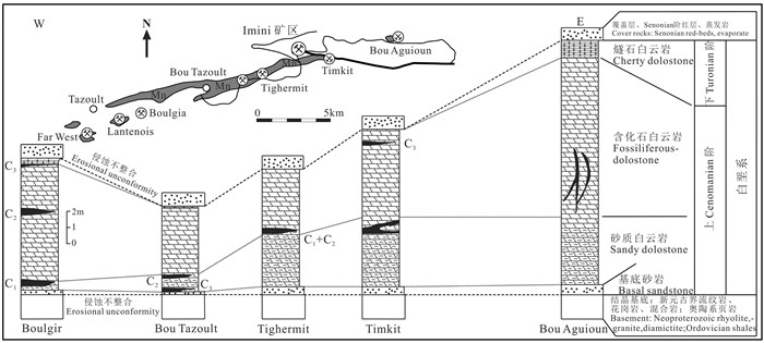 图 9 伊米尼(Imini)锰矿带含矿地层柱状图(据Mohammed, 2016) Fig. 9 Stratigraphic columns from west to east across the district showing stratabound but not stratiform character of Mn orebodies; inset shows plan view of Mn belt and locations of mines (after Mohammed, 2016) |