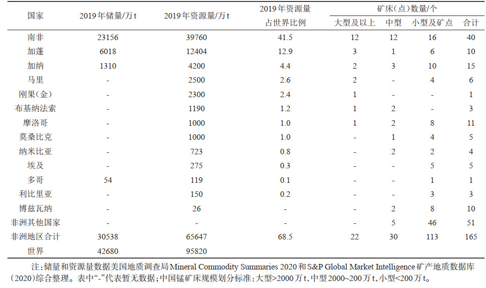 表 1 非洲主要锰矿资源国锰矿石资源量/储量和锰矿床(点)统计表 Table 1 Summary of manganese ore resources/reserves of major manganese ore resource countries in Africa |