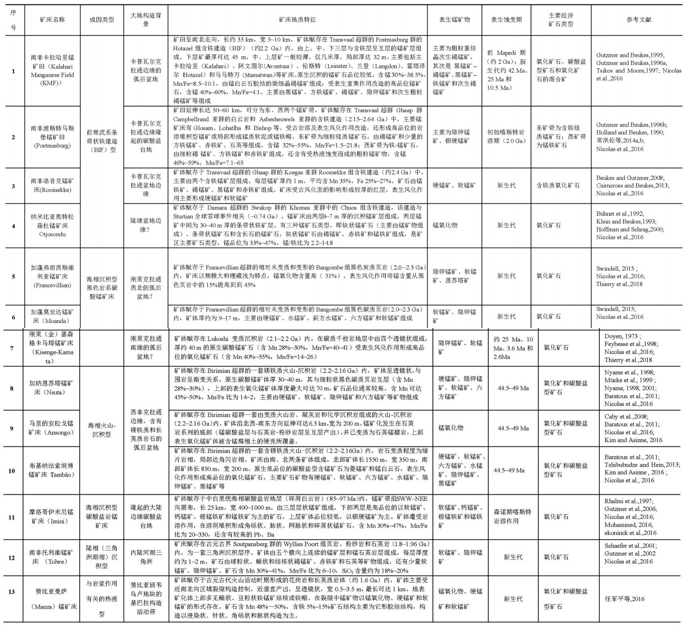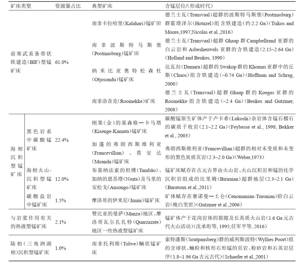 西非比利姆岩系(Birimian)锰矿床、刚果基森格(Kisenge)的碳酸锰矿床及南非卡拉哈里锰矿田受表生风化作用形成高品位的锰氧化物矿石(Gutzmer et al., 2012)。