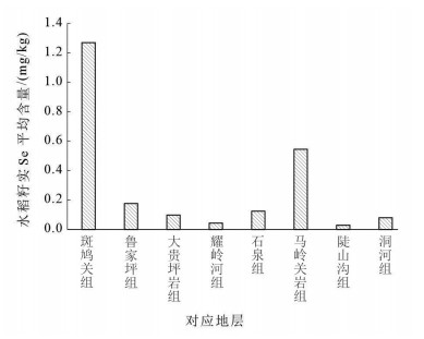 图 6 研究区水稻籽实硒平均含量与对应地层关系图 Fig. 6 Characteristics of selenium content incropsbetweenthe corresponding stratas |