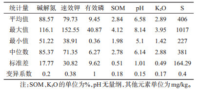 3 结果与讨论 3.1 土壤基本理化性质及养分含量状况研究区水稻根系土壤基本理化性质及养分含量状况如表 2。土壤pH变化范围在6.01~8.14,30%为碱性土壤,56%为微酸性土壤;土壤有机质(SOM)含量较高,变化范围为19.8~41.2 g/kg,平均含量为28.44 g/kg。