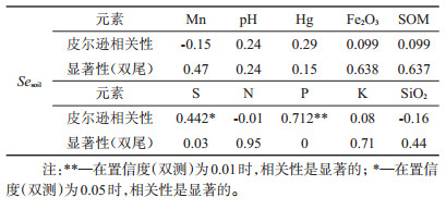 将土壤中的养分含量与Sesoil进行相关性分析,如表 3所示,与全硫(r=0.442, p<0.05)和全磷(r=0.712, p<0.01)含量呈现显著正相关,而与土壤pH、SOM、全氮及全铁、全钾、锰等元素含量均不相关,研究区土壤呈现出高硒伴随高含量全硫、全磷的特征。