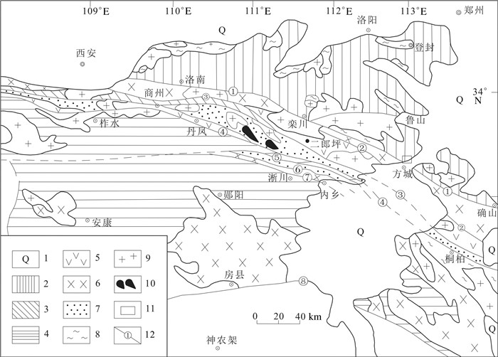 图 1 大庄一带区域地质简图 1—第四系;2—华北陆块盖层;3—中秦岭盖层;4—南秦岭盖层;5—下古生界;6—中—新元古界;7—古元古界;8—太古界;9—花岗岩;10—超镁铁岩;11—大庄矿区位置;12—主要断裂及编号;①洛南—栾川断裂;②瓦穴子—小罗沟断裂;③朱阳关—夏馆断裂;④商—丹断裂;⑤木家垭—西峡断裂;⑥小陡岭—田关断裂;⑦尖坏寨—黄风垭断裂;⑧城口—房县断裂 Fig. 1 Regional geological map of Dazhuang deposit 1-Quaternary; 2-Caprock of North China plate; 3-Caprock of mid-Qinling; 4-Caprock of Southern Qinling; 5-Lower Paleozoic; 6-Meso-Neoproterozoic; 7-Paleoproterozoic; 8-Archaeozoic; 9-Granite; 10-Ultramafic rock; 11-Mining area location of Dazhuang; 12-Main faults andits serial number: ①Luonan-Luanchuan fault; ②Wachangzi -Xiaoluogou fault; ③Zhuyangguan-Xiaguan fault; ④Shang-Dan fault; ⑤Mujiaya-Xixia fault; ⑥Xiaodouling -Tianguan fault; ⑦Jianlouzhai-Huangfengya fault; ⑧Chengkou-Fangxian fault |