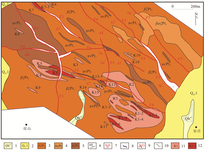 图 2 大庄矿区地质简图 1—全新统冲积层;2—下更新统鲁山组;3—中细粒黑云母正长岩;4—中细粒黑云角闪正长岩;5—中细粒角闪霞石正长岩;6—片麻理产状;7—构造蚀变岩;8—矿区边界;9—断层及编号;10—地质界线;11—低品位铌矿体及编号;12—工业铌矿体及编号 Fig. 2 Simplified geological map of Dazhuang deposit 1-Holocene alluvium; 2-Lushan formation of lower Pleistocene; 3-Medium-fine biotite syenite; 4-Medium-fine biotite hornblende syenite; 5-Medium-fine hornblende nepheline syenite; 6-Gneissose occurrence; 7-Structural altered rock; 8-Mine field border; 9-Fault and its serial number; 10-Geological boundary; 11-Low grade niobium orebody and its serial number; 12-Industrial niobium orebody and its serial number |
