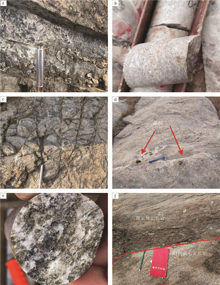 图 3 碱性正长岩样品野外照片 a—角闪霞石正长岩;b—黑云母正长岩;c—霞石正长伟晶岩;d—碱性正长岩中晶洞;e—角闪霞石正长岩中萤石;f—黑云母正长岩和角闪霞石正长岩呈渐变过渡关系 Fig. 3 Field and Microscope photographs of alkalinesyenite samples a-Hornblende nepheline syenite; b-Biotite syenite; c-Nepheline syeuite pegmatite; d-Miarolitic inalkaline syenite; e-Fluorites in hornblende nepheline syenite; f-Biotite syenite and hornblende nepheline syenite tend to show gradational relationships |