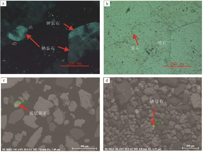 图 4 碱性正长岩样品镜下照片 a—角闪霞石正长岩中交代形成的钠长石;b—角闪霞石正长岩中后期萤石晶体充填分布于霞石晶体裂隙;c—褐钇铌矿的背散射电子图像; d—烧绿石的背散射电子图像 Fig. 4 Microscope photographs of alkaline syenite samples a-Albite formed by metasomatism in hornblende nepheline syenite; b-Fluorite crystal filling and distribution in nepheline crystal cracks in the middle and late period of hornblende nepheline syenite; c-Back-scattered electron images of fergusonite; d-Back-scattered electron images of pyrochlore |