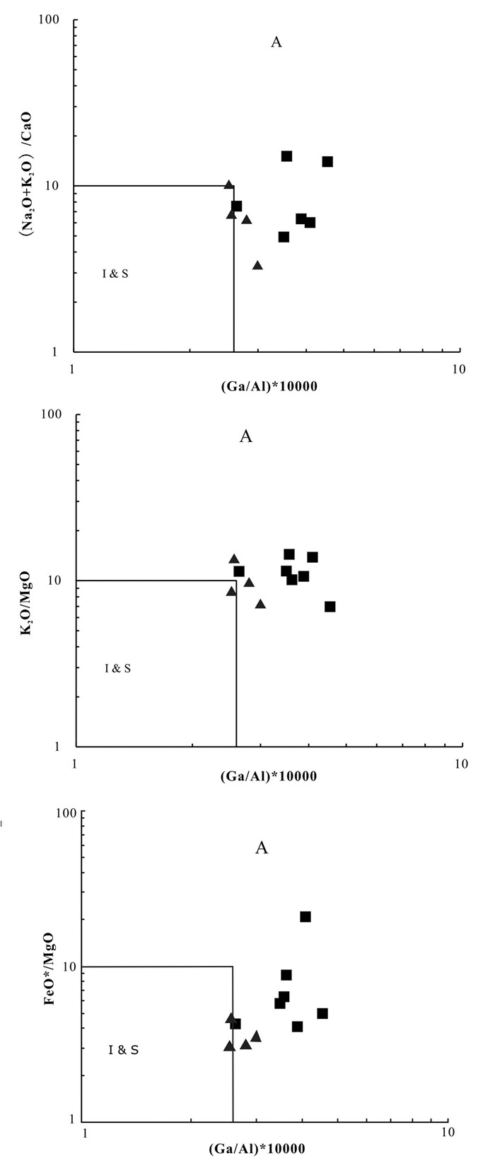 图 5 大庄碱性正长岩(Ga/Al)-(Na2O+K2O)/CaO、(Ga/Al)-FeO/MgO、(Ga/Al)-K2O/MgO图解 (据Whalen et al., 1987; 方块代表含矿碱性正长岩,三角代表无矿碱性正长岩) Fig. 5 (Ga/Al)vs.(Na2O+K2O)/CaO, (Ga/Al) vs. FeO/MgO, (Ga/Al) vs. K2O/MgO diagrams for the Dazhuang alkaline syenite (after Whalen et al., 1987; Square for ore-bearing alkalinesyenite, triangle for non-mineral alkaline syenite) |