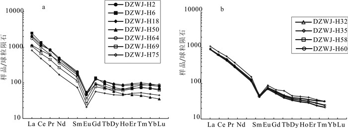 图 6 含矿(a)与无矿化碱性正长岩(b)的稀土元素分配模式 (据Sun and McDonough, 1989; 样号同表 1) Fig. 6 REE distribution pattern of ore-bearing (a) and non-mineral(b) alkaline syenite (after Sun and McDonough, 1989; Sample code are same as table 1) |