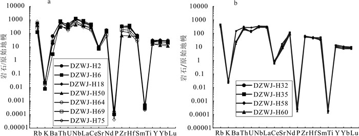图 7 含矿(a)与无矿碱性正长岩(b)原始地幔标准化微量元素蛛网图 (据Sun and McDonough, 1989; 样号同表 1) Fig. 7 Spidergram of ore-bearing (a) and non-mineral(b) alkaline syenite (after Sun and McDonough, 1989; Sample code are same as table 1) |
