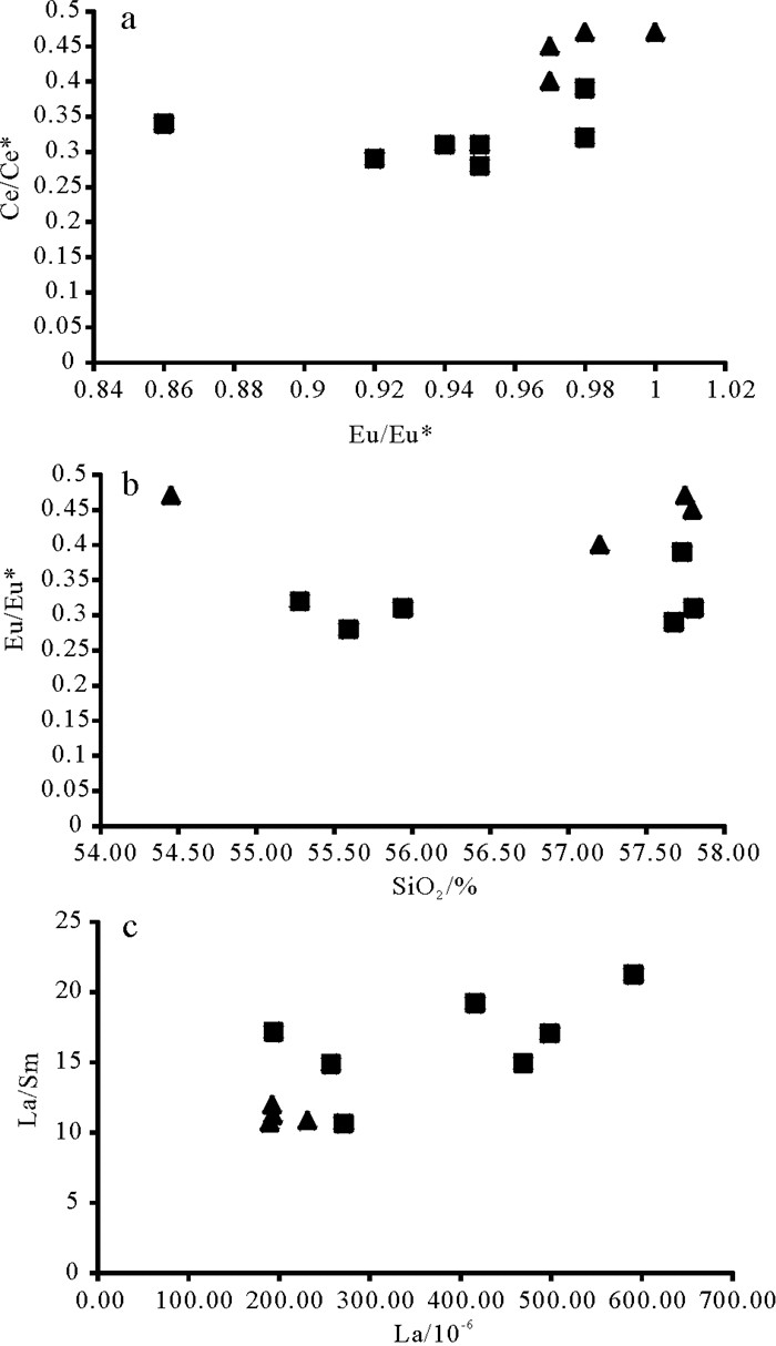图 8 大庄碱性正长岩δEu-δCe、SiO2/%-δEu、La/10-6-La/Sm图解 (据杨武斌,2009; 方块代表含矿碱性正长岩,三角代表无矿碱性正长岩) Fig. 8 δEu vs. δCe, SiO2/% vs. δEu, La/10-6 vs. La/Sm diagrams for Dazhuang alkaline syenite (afterYANG Wubin, 1989; square for ore-bearing alkaline syenite, triangle for non-mineral alkaline syenite) |