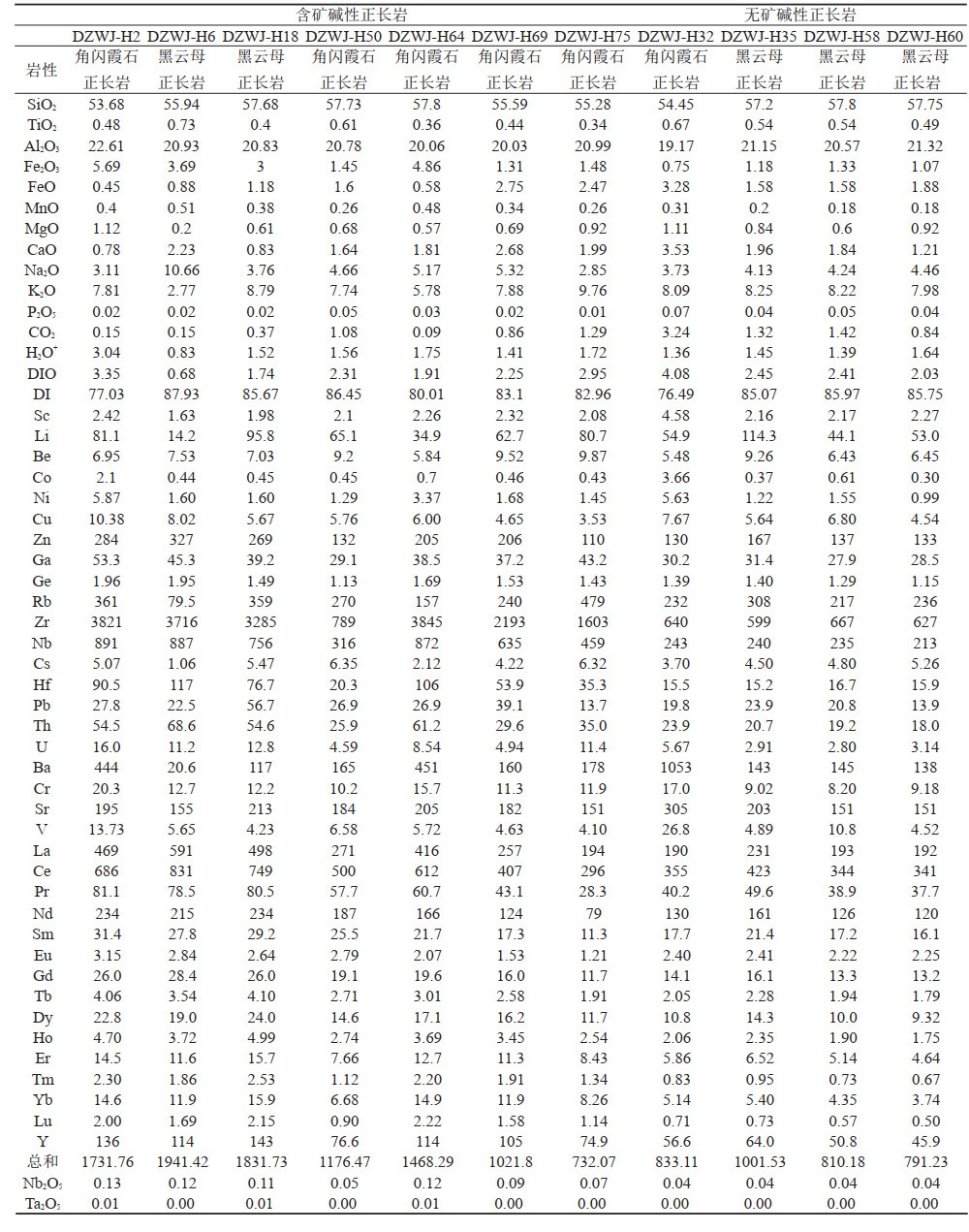 4 采样及分析测试为研究方城大庄碱性正长岩的地球化学特征,按岩石类型采集了相对新鲜的测试样品。在探槽工程中采集了DZWJ-H2、DZWJ-H6、DZWJ-H18、DZWJ-H64、DZWJ-H69、DZWJ-H75,在钻孔中采集了DZWJ-H32、DZWJ-H35、DZWJ-H58、DZWJ-H60(表 1)。样品送自然资源部武汉矿产资源监督检测中心进行主量、微量及稀土元素测试。主量元素分析采用仪器为RIX2100型X射线荧光光谱仪,样品分析精度优于5%;稀土元素和微量元素分析采用仪器为Agilent7500a ICP-MS,分析精度优于10%。