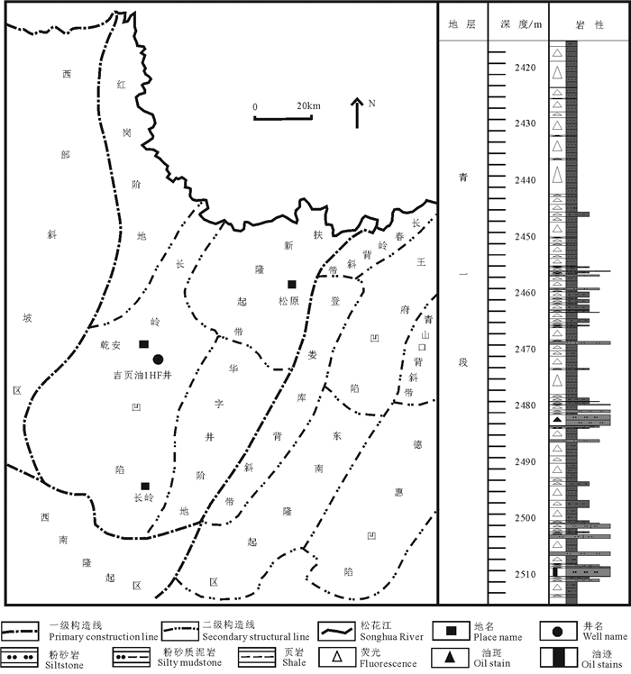 2 松辽盆地陆相页岩地层特征及钻探难点 2.1 松辽盆地青一段地层特征松辽盆地南部整体划分为中央坳陷、西部斜坡、东南隆起和西南隆起4个一级构造单元,中央坳陷是页岩油形成和富集的最主要区域,面积约6500 km2,页岩油主要分布在下白垩统青山口组一段地层中(黄文彪等,2014;薛海涛等,2015;李士超等,2017;李微等,2018)。本文研究对象吉页油1HF井部署在松辽盆地南部中央坳陷长岭凹陷的乾安有利区内,该井导眼井在青一段页岩地层中钻遇了良好的页岩油显示,青一段厚度一般为90 m,岩性主要为深灰色、灰色页岩,夹少量灰色、灰白色泥质粉砂岩、粉砂岩,累计砂地比10%左右(图 1)。