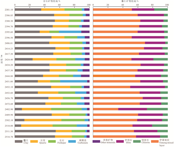图 2 吉页油1井青一段页岩全岩矿物及黏土矿物组成 Fig. 2 The composition of whole-rock minerals and clay minerals of the shale in the Qing 1st of Jiyeyou 1 well |