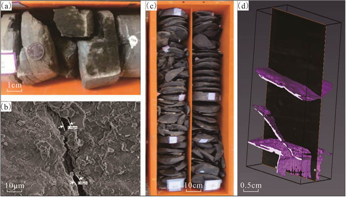 图 3 吉页油1HF井青一段页岩裂缝发育特征图 a—高角度构造裂缝,岩心;b—页岩储层微裂缝,扫描电镜;c—水平层理缝,岩心;d—构造裂缝与层理缝形成的交错缝网,CT扫描 Fig. 3 Fracture development characteristics of shale in the Qing 1st of Jiyeyou 1 well a-High-angle structural fractures, cores; b-Micro fractures in shale reservoirs, scanning electron microscope; c-Horizontal bedding fractures, cores; d-The staggered fracture network formed by structural fractures and bedding fractures, CT scan |