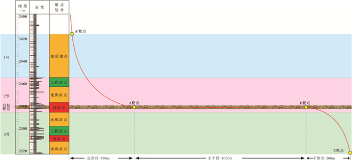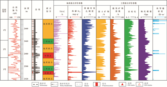 3 水平井甜点靶层优选及轨迹设计 3.1 地质-工程双甜点靶层优选根据青山口组一段岩心、岩相、含油性、物性、可动油占比、岩石力学性质、可钻性、可压性、裂缝发育程度等特征,对有利目标层和目标靶层进行了优选确定。自上而下共划分为3个层组(图 4)。
