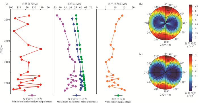 井眼稳定性是地应力、地层压力、岩石力学性质和泥浆密度等参数综合作用的结果。对于水平井而言,随着水平井方位和井斜角的不同,孔周应力环境变得更加复杂(闫传梁等,2013;崔云海等,2016;孙东生等,2020)。根据偶极子声波、地层岩石力学、地层压力等参数,建立了基于流变模型的地应力剖面(图 6a),目的层最小水平主应力分布在42~53 MPa,最大水平主应力分布在56~63 MPa,最大水平主应力方向为近东西向,根据水平井走向尽量垂直于最大主应力方向原则,确定吉页油1HF井钻探方位为180°,同时,预测了水平井周向应力分布及对应的泥浆密度,获取了水平井不同位置、方位和井斜角条件下的泥浆密度窗口。根据预测结果显示,随着井斜角增大,防止井壁发生坍塌的临界钻井液密度逐渐增大。造斜段垂深2000~2416 m,井斜角在0~60°,以垂深2399.4 m的位置为例,沿180°方位角,井斜角在0~60°时,保证井筒安全的泥浆窗口密度在1.20~1.55 g/cm3(图 6b);水平段垂深2416~2530 m,井斜角60~90°,所需泥浆密度较大,泥浆密度窗口为1.35~1.60 g/cm3(图 6c),为水平井施工提供了有效的参考指导。