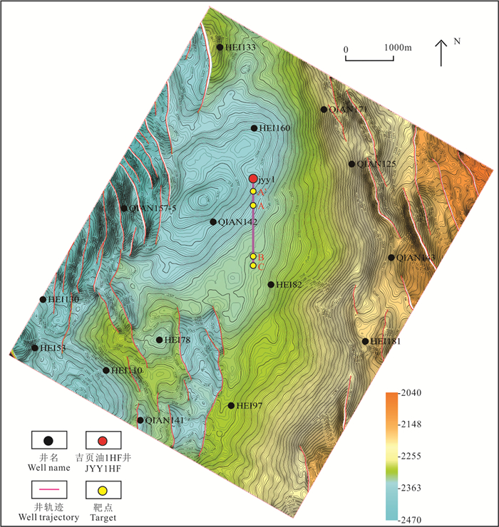 图 7 吉页油1HF井目标靶层顶面深度三维构造图 Fig. 7 Three-dimensional structure diagram of the top surface depth of the target layer of Jiyeyou 1HF well |