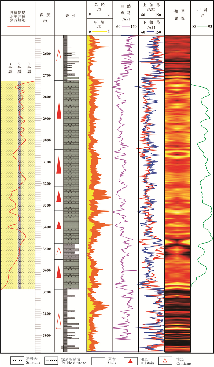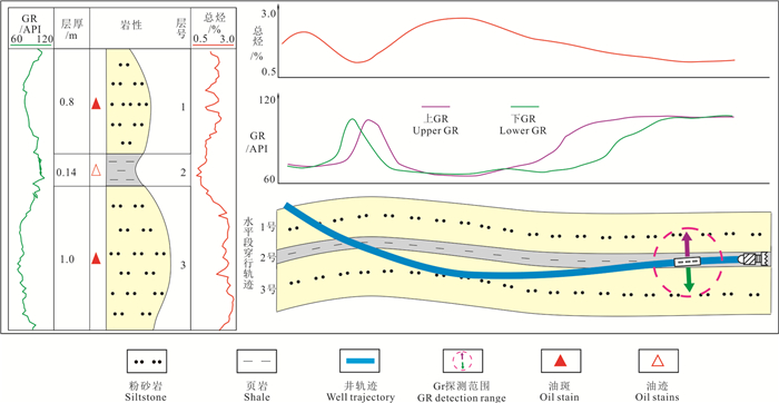 由于水平井目标靶层较薄,厚度仅有1.94 m,导向难度大,难以保证水平井沿目标靶层连续钻进1000 m不出层,为了提高储层钻遇率,对目标靶层岩性、电性、含油气性等地层性质进行大比例尺精细描述,构建精细地质模型,将目标靶层在纵向上自上而下划分出3个小层,它们在岩性、气测总烃、电测伽马曲线上均呈现明显差别(图 8),可以作为精确导向的地质依据。此3小层具体岩电特征如下:1号小层:岩性为粉砂岩,厚约0.8 m,低伽马值80~90,气测总烃0.8%~1.5%;2号小层:岩性为泥质粉砂岩,厚约0.2 m,高伽马100~110,气测总烃0.5% ~1%;3号小层:岩性为粉细砂岩,厚约1 m,低伽马70~80,气测总烃1%~2.5%。基于以上差异,优选岩性录井、气测录井、伽马随钻测井3种随钻地质导向手段,结合地层倾角预测技术,构建基于实钻岩性、气测总烃、随钻伽马、地层倾角等参数为核心的导向地质模型(图 8),为水平井地质导向提供精细可靠的地质依据。