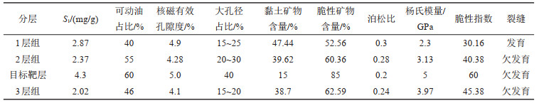 1号层组发育层理型页岩岩相,有效储集空间以层理缝、基质微裂缝及局部发育的高角度缝为主,含油性好,孔隙度高,泊松比高、杨氏模量低,易于压裂,但由于黏土矿物含量高、层理和裂缝发育,可钻性较差,不宜作为水平井的主要穿行目标层。