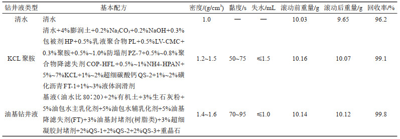 根据水平段地层特点及钻井技术难点,钻井液要保持强抑制、强封堵、较低的滤失量、薄而韧的泥饼、优良的造壁性和润滑性,以及良好的流变性和储层保护效果,保证安全快速钻进(尹增苇等,2013;孟英峰等,2019;王波等,2020;田璐等,2020)。通过钻屑回收率实验对水平井各开次的钻井液配方进行优选。二开选用强抑制KCL聚胺钻井液体系,三开采用油基钻井液体系,岩屑回收率试验表明,KCL聚胺钻井液钻屑滚动后回收率可达99.1%,油基钻井液钻屑滚动后回收率可达99.8%(表 3)。