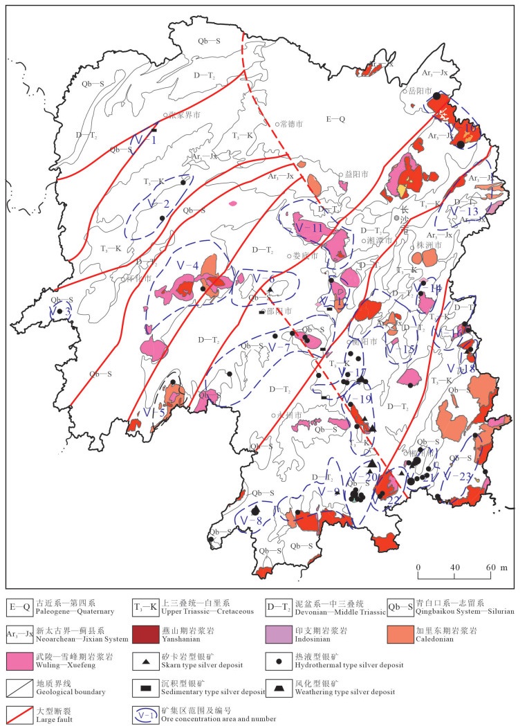 银的工业用途广泛,也是人民群众用于装饰美化生活的贵金属之一。湖南境内出产白银的记载资料,以宋代的《宋史·地理志》和《太平寰宇记》及《元丰九域志》记载的较详细。湖南银矿资源较丰富,银矿除洞庭湖外在全省均有发现,前人对湖南银矿进行了一定的勘查、开采和研究,并取得了一些普查、勘探、潜力评价、成矿预测等成果认识,但对银矿资源概况及成矿规律没有系统归纳和总结。本文在既有湖南银矿勘查及科研地质报告基础上,结合湖南银矿前人文献资料❶❷❸(郭玉乾等,2009),依据中国矿产地质志·省级矿产地质志研编技术要求❹,对湖南银矿资源进行系统梳理,对成矿规律进行总结、探讨,为湖南进一步寻找银矿提供参考。