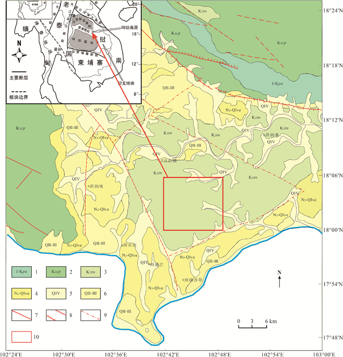 图 1 研究区位置及其构造图(据郭远生等,2005) 1—侏罗—白垩系Phu Pha Nang组;2—上白垩统Champa组;3—上白垩统Tha Ngon组;4—新近系中新统;5—上新统—第四系;6—第四系中—晚更新统;7—正断层;8—逆断层;9—推测断层;10—海夏峰矿区位置 Fig. 1 Location and tectonic diagram of Khorat Plateau(after Guo Yuansheng et al., 2005) 1-Jurassic—Cretaceous Phu Pha Nang Formation; 2-Late Cretaceous Champa Formation; 3-Late Cretaceous Tha Ngon Formation; 4-Neogene Miocene sediments; 5-Pliocene-Quaternary sediments; 6-Quaternary Middle—Late Pleistocene System; 7-Normal fault; 8-Reverse fault; 9-Speculate fault; 10-Location of Haixiafeng mining area |