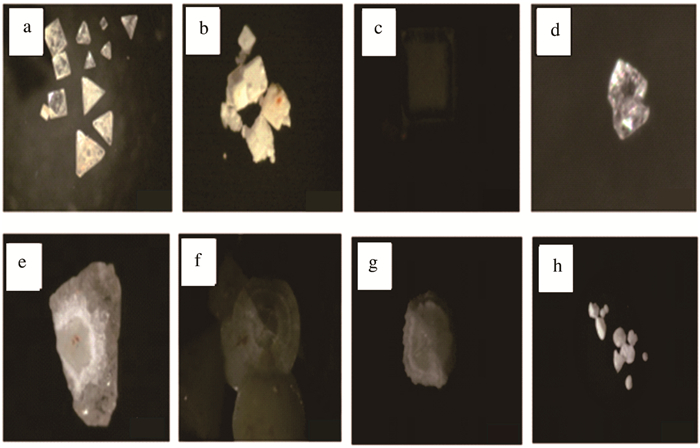 图 2 方硼石形貌特征(体视镜,×50) a—四面体方硼石;b—立方体方硼石;c—含乳白色内核方硼石;d—双晶状方硼石;e, f—同心环状鲕粒方硼石;g, h—放射状鲕粒方硼石 Fig. 2 Morphologic characteristics of boracites (stereoscope, ×50) a-Tetrahedral cubic borborite; b-Cubic borborite; c-Opalescent core-bearing cubic borborite; d-Bicarbonite; e, f-Concentric annular oolite; g, h-Radial oolite borborite |