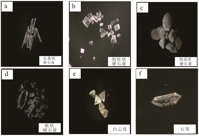 图 3 其他水不溶矿物的形貌特征(体视镜,×50) a—长条状硬石膏;b—短柱状硬石膏;c—隐晶质硬石膏;d—板状硬石膏;e—白云母;f—石英 Fig. 3 Morphologic characteristics of other insoluble minerals (stereoscope, ×50) a-Long strip anhydrite; b-Short column anhydrite; c-Cryptocrystalline anhydrite; d-Plate anhydrite; e-Muscovite; f-Quartz |