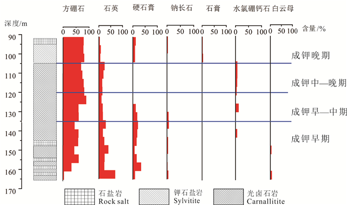 (1) 166~135 m:下部岩性为含光卤石和钾石盐的岩盐,上部岩性为含石盐夹层的光卤石岩,主要岩性特征表明卤水进入了钾盐析出阶段。主要水不溶物方硼石、硬石膏和石英。硬石膏和石英的含量呈逐渐递减趋势,而方硼石含量自下而上逐渐增加,这表明卤水逐渐浓缩,硫酸盐矿物逐渐减少而硼酸盐矿物逐渐浓缩析出。该阶段后期还发现了少量水氯硼钙石,表明在卤水蒸发浓缩到一定程度后,开始形成Ca的硼酸盐矿物。该阶段发现局部层位偶见黄铁矿产出,可能代表了卤水在某些时候为还原环境。该阶段还发现陆源碎屑白云母,白云母分布比较零散和广泛,但含量较少,石英和白云母的出现表明蒸发岩沉积时受到陆地水的重要影响。