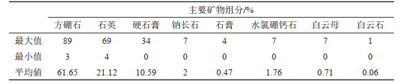 4 结果 4.1 主要水不溶物矿物组成XRD分析结果显示(表 1),水不溶矿物主要包括硬石膏、方硼石、白云母、石英、水氯硼钙石、碳酸盐矿物以及零散分布的黄铁矿等。其中,以方硼石和硬石膏是最主要的水不溶矿物,石英的含量也较多,其他矿物含量一般较少。