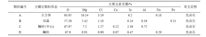 扫描电镜分析结果显示(表 2),方硼石颗粒中的主要元素为O、Mg、Cl及B(属于轻元素,未显示),但这些颗粒(无论是单晶体还是鲕粒)中基本都含有少量的Ca,大部分颗粒还含有一定Si和Al,有些颗粒中的Si、Al含量还特别高(图 4)。这表明方硼石颗粒的成分是复杂的,里面可能存在一些硼的硅酸盐矿物(张西营, 2012)。而在ZK16中只含有少量的Fe或者根本不存在,且Si、Al的含量也很少说明ZK16沉积环境较为简单。