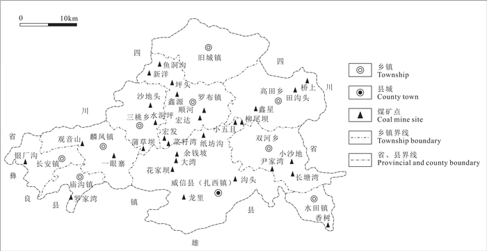 3 研究方法与数据来源 3.1 研究区概况 3.1.1 煤矿资源分布特征及开发利用情况威信县(104°41′59″~105°18′32″E,27°43′06″~28°06′10″N)地处云南省东北隅,国土总面积达1400 km2,下辖3乡7镇(高田乡、三桃乡、双河苗族彝族乡、罗布镇、麟凤镇、庙沟镇、扎西镇、水田镇、旧城镇和长安镇)。县域内煤矿资源丰富,2003年,西安卫星遥感测控中心通过卫星遥感测控计算全县煤矿资源探明储量达40余亿t,其中无烟煤探明储量1.52亿t,分布在除旧城镇外的其他9个乡镇(图 1)。截止2015年底,全县开发利用的矿产主体是煤,共有煤矿山36个,均为小型矿,辖区内还蕴藏有煤层气、页岩气、硫铁矿、石灰石等其他资源。