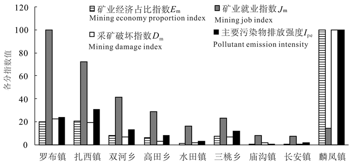 从单个指数角度分析(图 3),威信县9个乡镇中麟凤镇的矿业经济占比指数最大,达到了100,远远高于其他乡镇,表明麟凤镇的煤矿产业是其经济发展的支柱产业,对威信县矿业经济贡献很大。但其采矿破坏指数和主要污染物排放强度也位于9个乡镇之首,二者均达到了100,且其矿业开发指数仅为24.36,为威信县9个乡镇最低(图 4)。可见麟凤镇的煤矿产业在给当地的经济增长带来广阔发展空间的同时,其煤矿开采及加工等各种矿业活动给当地的生态环境也带来了巨大压力。其次为罗布镇和扎西镇,其矿业经济占比指数分别为20.21和20.42,这两个乡镇对威信县的矿业经济发展也有一定程度的贡献,其他5个乡镇的矿业经济占比指数均在10以下,对威信县的矿业经济贡献较小。