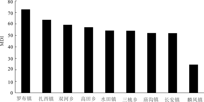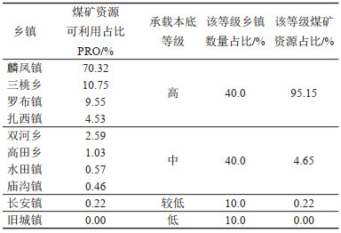 总体来看,威信县煤矿资源承载本底较高,煤矿资源自然禀赋较好。10个乡镇中有9个乡镇分布有煤矿资源,但煤矿资源量分布相对不平衡。由表 10和图 2所示,承载本底“高”的乡镇占据了4个,按煤矿资源可利用量占比由高到低分别为麟凤镇、三桃乡、罗布镇、扎西镇,共占威信县煤矿剩余可采探明储量的95.15%,其中仅麟凤镇一个乡镇的煤矿资源剩余可采探明储量占比就达到了70.32%,远远高于其他乡镇,可见麟凤镇蕴含着丰富煤矿资源,目前尚具有很大的开发潜力。承载本底为“中”的乡镇有4个,按煤矿资源可利用量占比由高到低分别为双河乡、高田乡、水田镇、庙沟镇,共占威信县煤矿剩余可采探明储量的4.65%。承载本底“较低”的乡镇为1个(长安镇),占威信县煤矿剩余可采探明储量的0.22%。鉴于旧城镇没有煤矿资源分布,其承载本底即为“低”。