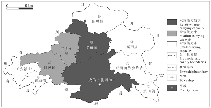 在承载本底与承载状态评价结果的基础上,根据矿产资源承载能力等级划分标准,分别得到了威信县10个乡镇的煤矿资源承载能力等级(表 12),进而得到威信县煤矿资源承载能力评价图(图 6)。虽然威信县多数乡镇的煤矿资源自然禀赋良好,其承载本底多数为“高”和“中”级别,但承载能力评价结果显示威信县煤矿资源承载能力总体不太乐观。10个乡镇中,没有煤矿资源承载能力“大”的乡镇,承载能力“较大”的乡镇仅有2个,分别为罗布镇和扎西镇。承载能力“中”的乡镇有2个分别为三桃乡和麟凤镇。威信县大多数乡镇的煤矿资源承载能力为“小”级别,数量达到了6个,分别为双河乡、水田镇、庙沟镇、高田乡、长安镇和旧城镇。