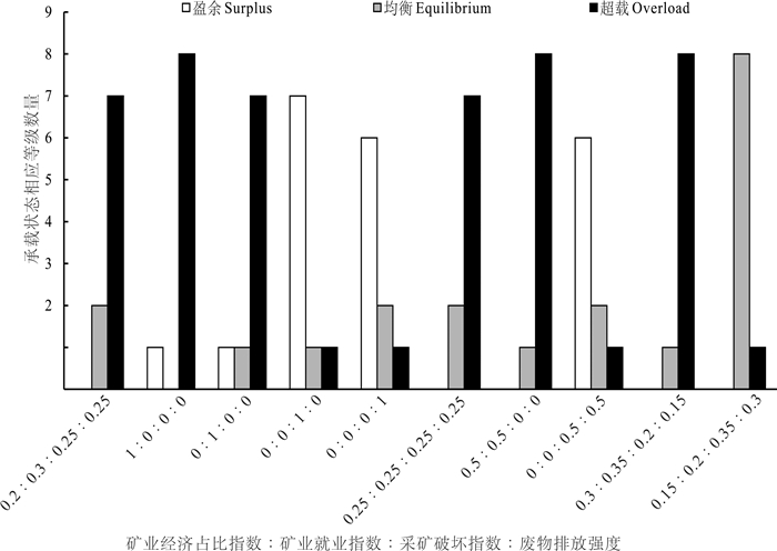 5.1.2 各评价指数系数的权重分配评价结果能否真实反映现实情况,关键在于正向指标(矿业经济占比指数、矿业就业指数)和负向指标(采矿破坏指数、废物排放强度)的权重分配。依据4个分指数不同权重分配的原则(实施方案设计值、只受某一分指数影响、权重平均分配、只受正向指标影响、只受负向指标影响、正向指标权重高、负向指标权重高),统计了10种不同权重分配情况下,威信县煤矿资源承载状态评价结果(表 13)。并依据统计结果,得出评价结果直方图(图 7)。