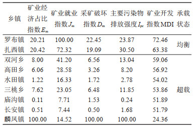 总体来看,威信县煤矿资源承载状态堪忧(图 5)。10个乡镇中有9个乡镇分布有煤矿资源,但其承载状态仅有“均衡”、“超载”2个级别,没有“盈余”级别。其中,威信县承载状态“均衡”的乡镇仅有2个,按矿业开发指数由高到低分别是罗布镇和扎西镇,其煤矿矿业开发指数分别为72.46和63.38。多数乡镇煤矿资源承载状态为“超载”,按矿业开发指数,由高到低分别是双河乡、高田乡、水田镇、三桃乡、庙沟镇、长安镇和麟凤镇,其煤矿矿业开发指数分别为59.06、56.92、54.02、53.86、51.89、51.79和24.36(图 4)。