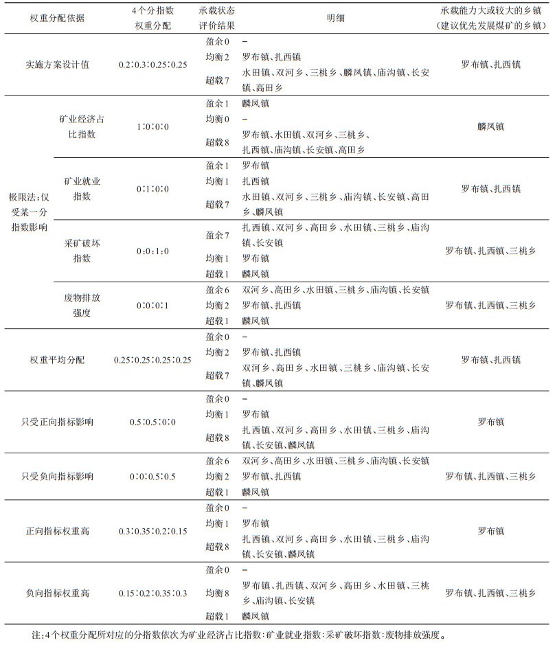 表 13 由不同权重分配的各分指数得出的威信县煤矿资源承载状态评价结果 Table 13 Coal mine resources carrying state evaluation results of Weixin County based on different weight distribution of index |