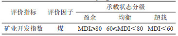 在完成上述评价的基础上,对煤矿资源承载状态进行综合评价,承载状态等级划分为盈余、均衡、超载3个等级,划分具体标准如表 5所示。