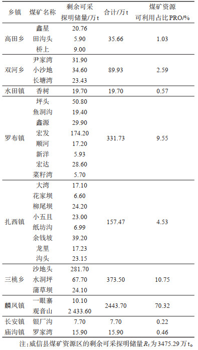 表 7 威信县煤矿探明储量信息及各乡镇资源可利用量占比情况 Table 7 Proven reserves information of coal mines in Weixin County and the proportion of resources available in each township |