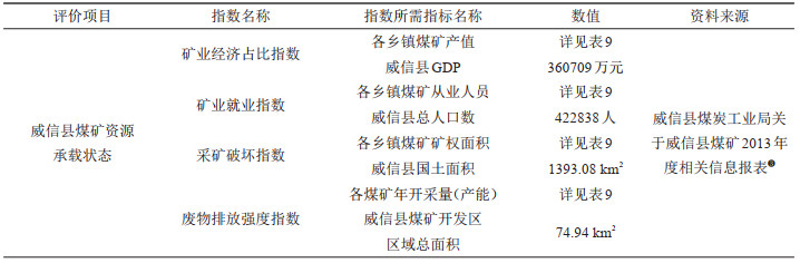 威信县煤矿资源承载状态各评价指标所需数据及来源详见表 8、表 9。