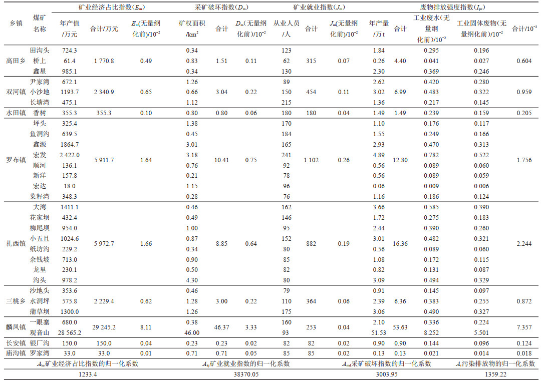 图 3 威信县煤矿矿业开发指数各分指标分布图 Fig. 3 Distribution of sub indexes of mining development index in Weixin County |