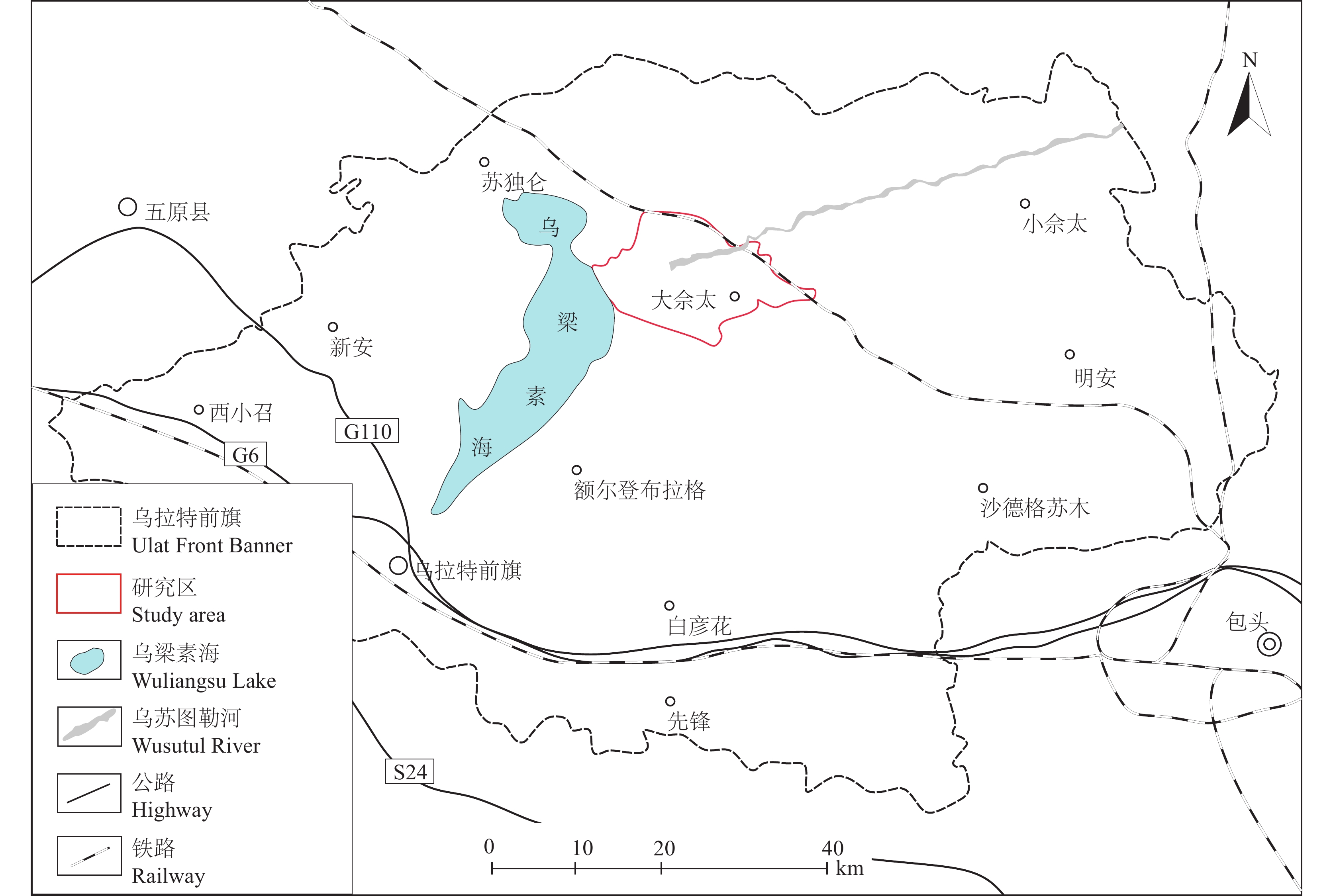大佘太地区属河套平原,位于阴山山脉与乌梁素海中间,主要由山前冲洪积平原和冲湖积凹陷两部分组成,同时也是内蒙古重要的商品粮和矿产基地(刘君等,2017)。该地区山前发育大小不等的冲洪积扇群,向南过渡为冲积湖积平原,西侧的乌梁素海为地下水的侧向排泄边界。由于地质与地貌特征的控制,该地区表层地质作用发育强烈,重金属元素具备迁移的地质条件,并存在局部富集的风险。同时,随着近年来人类活动影响逐渐增强,如农业区化肥的大量使用,山区玉石、铁矿等矿业活动频繁,以及居住区燃煤取暖等行为,导致该地区重金属等污染元素存在人为影响与扩散的可能,土壤质量有待于进一步研究评价。针对河套地区以冲洪积物为母质的农田土壤,目前对其可能存在的重金属污染分析和评价关注较少,且大佘太地区暂未开展农田土壤重金属污染的系统性调查评价。因此,本文利用该地区农用地表层土壤样品数据,采用地累积指数法、潜在生态危害指数法和健康风险评估模型等方法,系统研究土壤重金属分布特征与污染程度,开展潜在生态风险和人体健康风险评价,分析元素来源与富集原因,为研究区生态环境保护、居民健康以及土壤重金属来源解析等提供了科学依据。