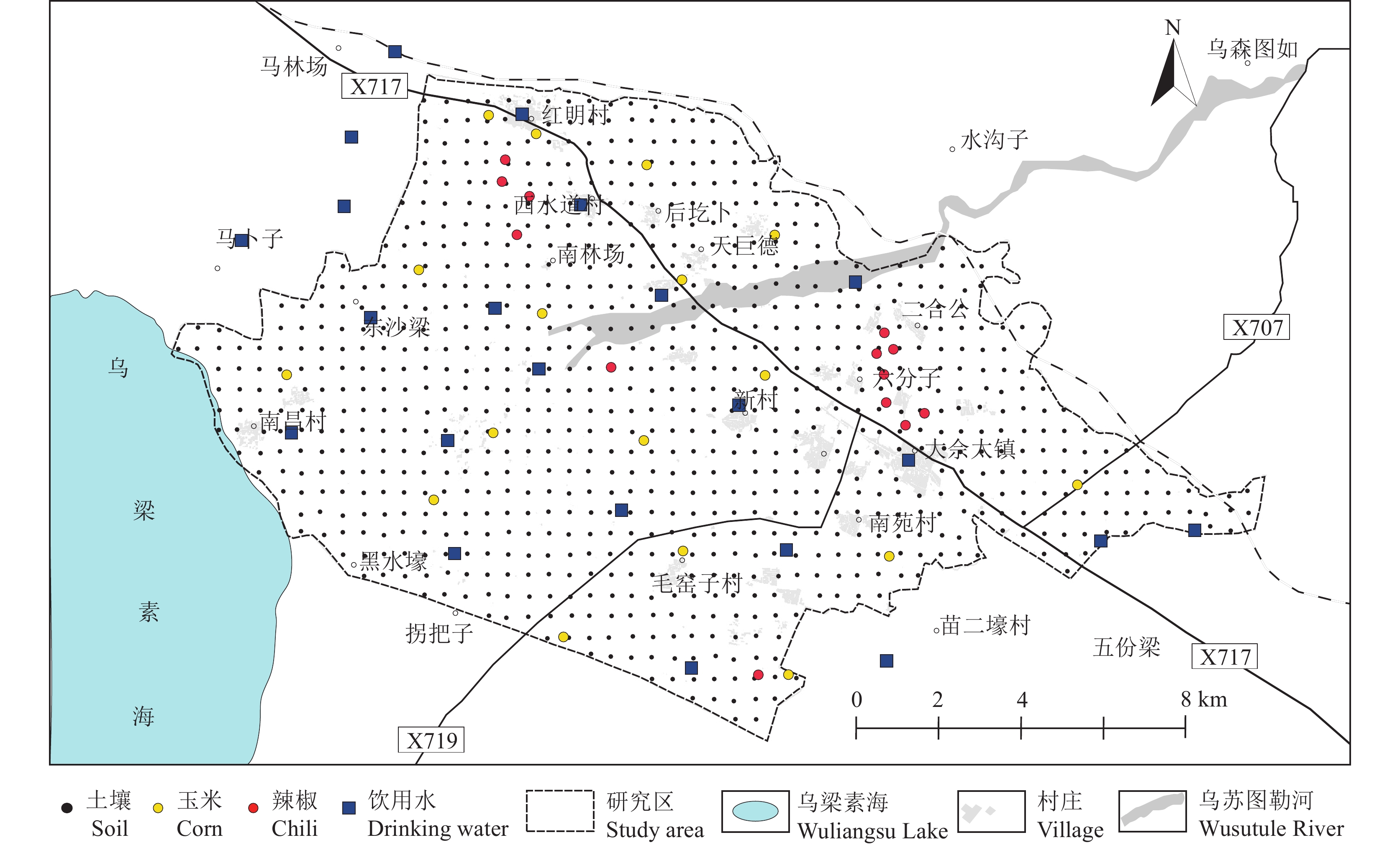 2 研究区概况乌拉特前旗大佘太地区位于河套平原东缘,东北靠阴山山脉(色尔腾山),西南临乌梁素海(图1)。研究区地形总体为东北高西南低,地貌以平原为主,总面积为213.62 km2。区内水系属黄河流域,乌苏图勒河为研究区主要的地表水系,该河为季节性河流,平常河床干涸无水,河流从色尔滕山出山后形成了较大了冲积扇,河水穿过研究区汇入乌梁素海。土壤类型以灌淤栗钙土和淡栗钙土为主,成土母质主要为冲洪积与冲湖积物。区内属中温带大陆性季风气候,日照充足,积温较多,昼夜温差大,雨水集中,雨热同期。历年平均日照时数为3130 h,年平均气温为5.6℃,无霜期100~145 d,年降水量在180 mm,主要集中在6—9月,占全年降水量的78.9%;年蒸发量2365 mm,封冻期4个月,年平均风速1.6 m/s。农田的主要类型为水浇地,灌溉水主要为地下水,种植作物以玉米、向日葵、辣椒为主。当地居民饮水均为地下水,粮食作物主要为自家种植的小麦和玉米,蔬菜大部分为自家种植,饮食结构为自产自销。大佘太镇是乌拉特前旗重要的产粮基地,已入选“2021年农业产业强镇创建名单”。