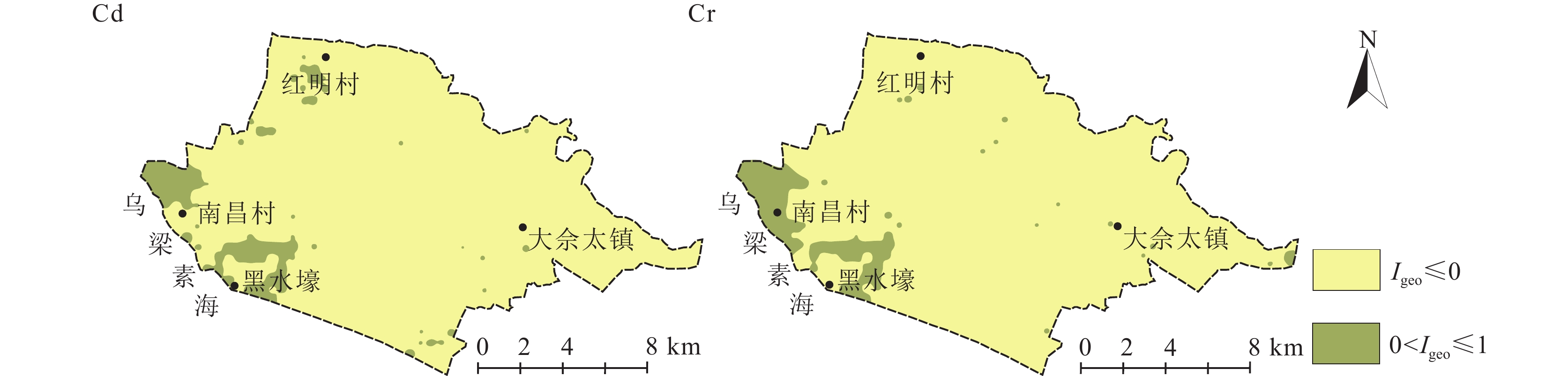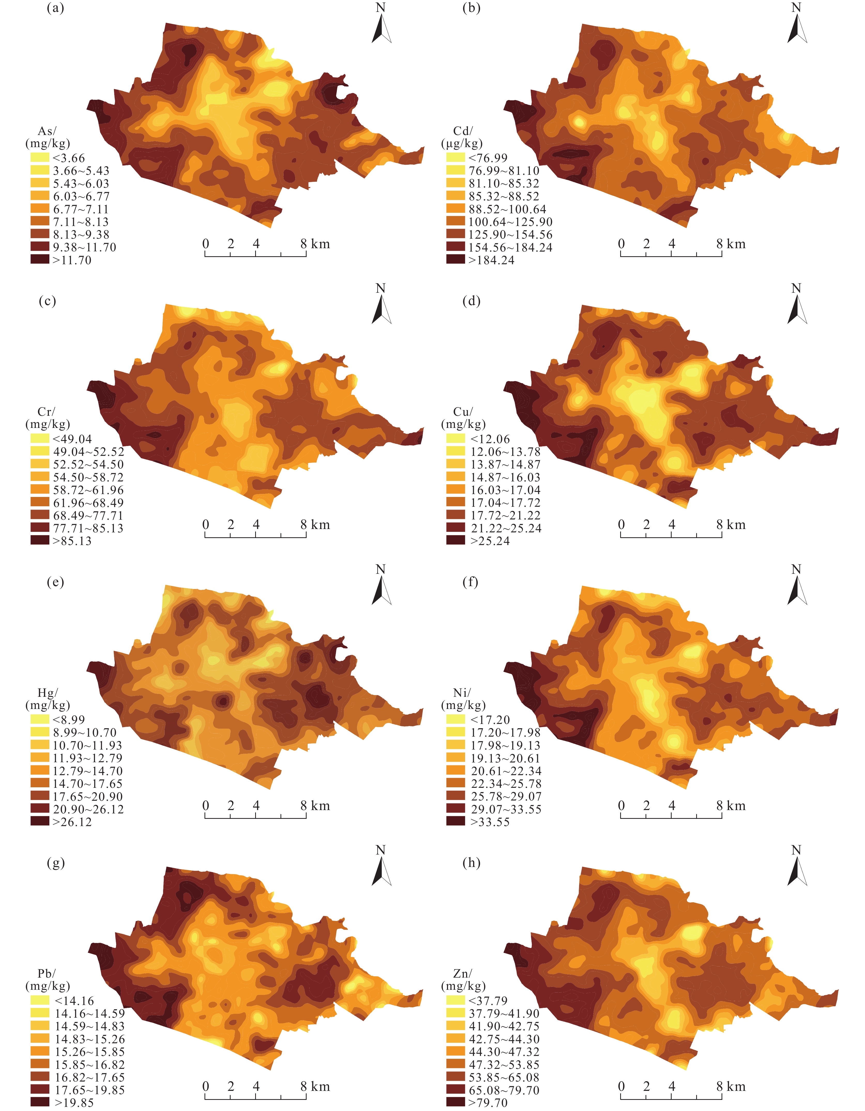 (2)As、Cd、Cr、Cu、Ni、Pb和Zn元素含量空间分布特征相近,来源较为单一,以成土母质为主。Hg元素受人为活动影响较大。地累积指数评价结果表明,8种重金属元素单值均存在轻污染的点位,其中Cd、Cr、Cu三个元素占比最多,且污染样本数与分布区域较为接近。