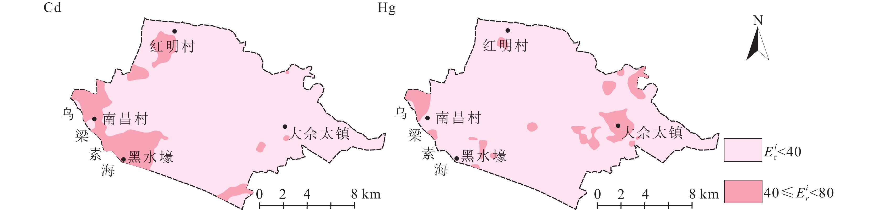 (3)重金属潜在生态风险评价结果表明,研究区土壤潜在重金属生态危害主要以轻微风险和中等风险为主,中等以上风险元素主要为Cd和Hg,且Hg有少量样本达到强风险级别。Cd风险区主要分布在乌梁素海沿岸的南昌村、黑水壕一带。Hg风险区主要为大佘太镇人类活动集中区。