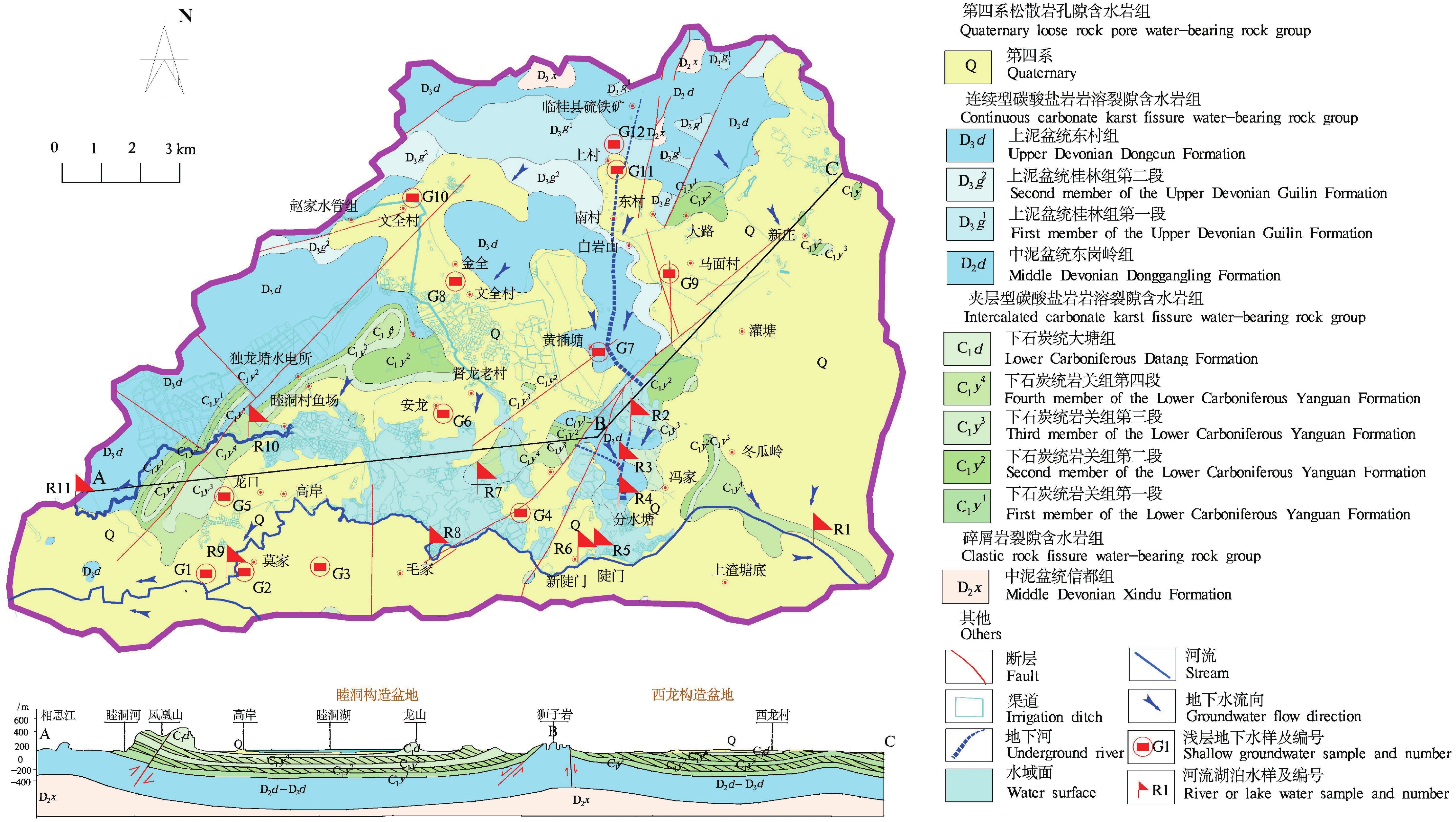 图 1 会仙岩溶湿地水文地质与采样点分布图 Fig. 1 Hydrogeological and sampling distribution of Huixian karst wetland |