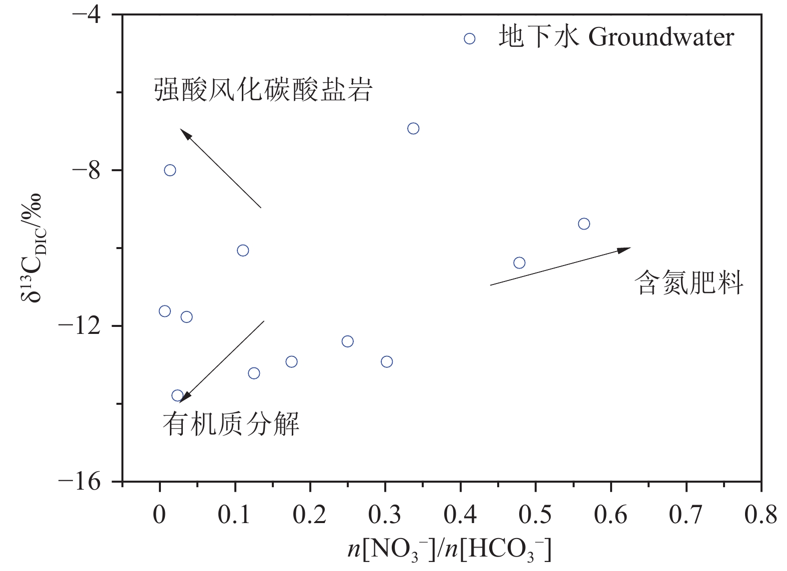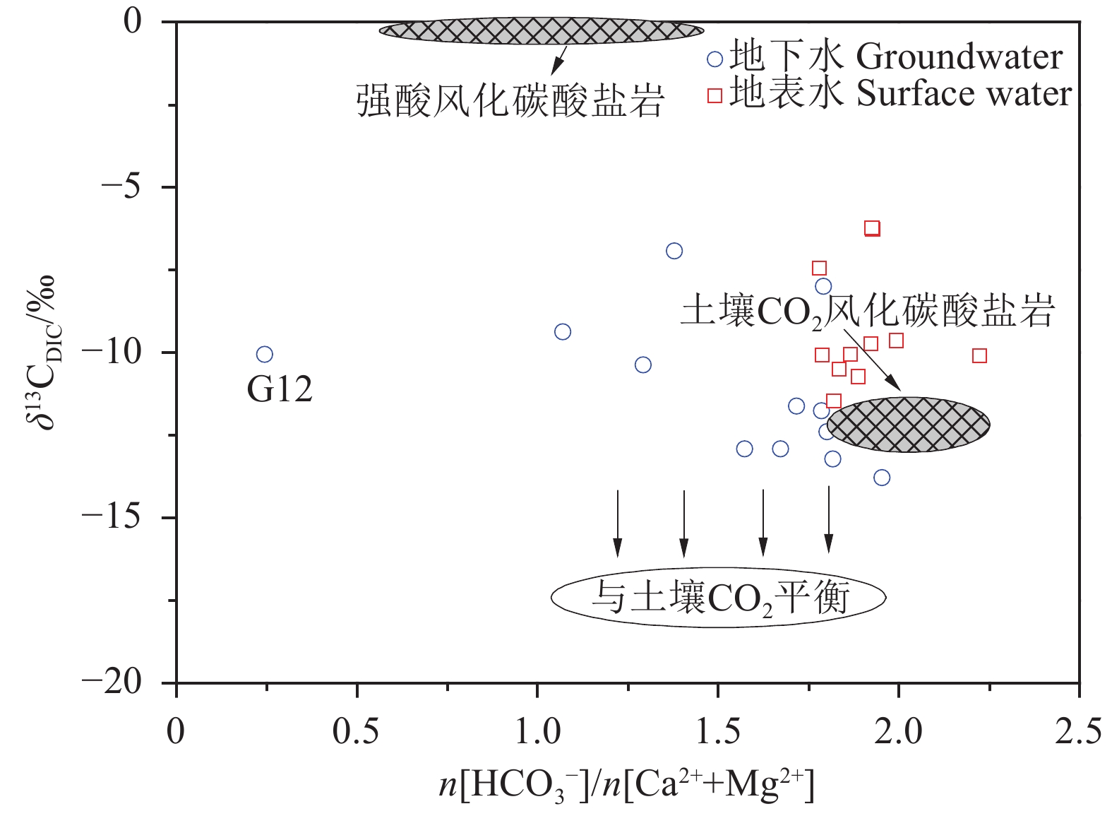 一般来说,只有H2CO3参与碳酸盐岩风化时,n[HCO3−]/n[Ca2++ Mg2+]为2;只有H2SO4参与碳酸盐岩风化时为1;如果Ca2+和Mg2+来源于肥料或SO42−、HCO3−有其他来源时,n[HCO3−]/n[Ca2++Mg2+]趋于0。n[HCO3−]/n[Ca2++Mg2+]与δ13CDIC值的关系(图10)表明,H2SO4参与碳酸盐岩的风化会导致部分地下水δ13CDIC偏正。比较特殊的是G12点,该点处受硫铁矿氧化会产生大量SO42−,n[HCO3−]/n[Ca2++Mg2+]趋于0。