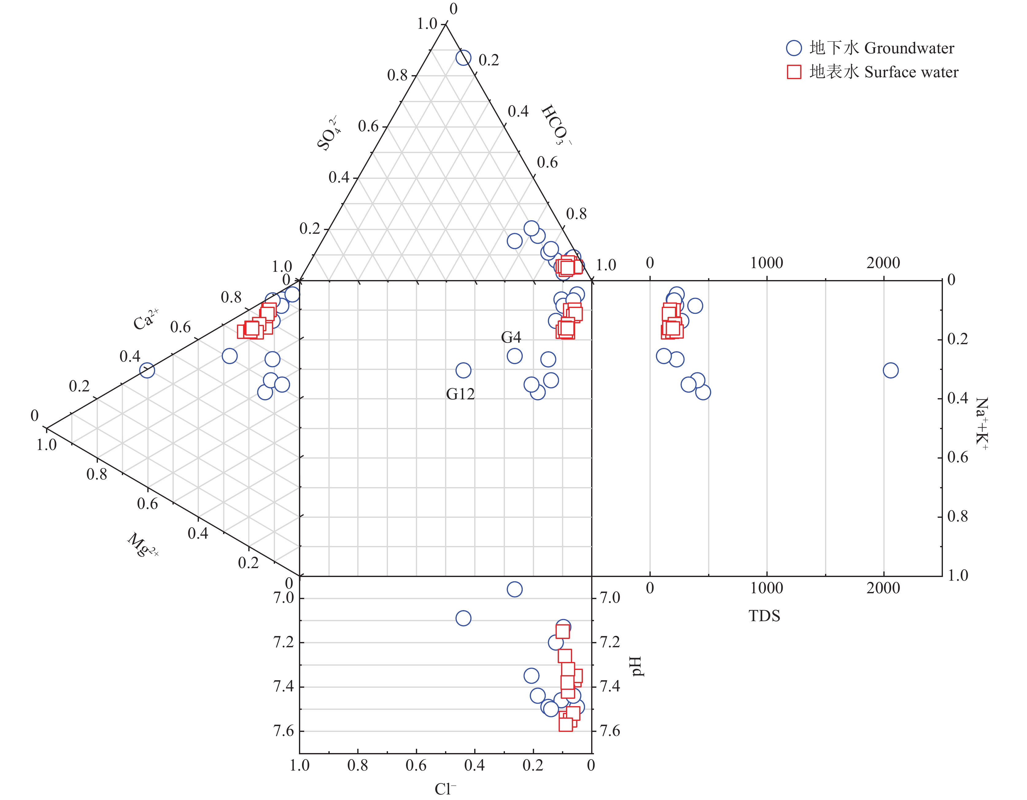 会仙岩溶湿地地下水和地表水水化学参数统计(表1)可以看出:研究区水体pH介于6.96~7.57,呈中性和弱碱性。TDS变化范围为117.72~2059.71 mg/L,水样多为低矿化度的淡水(TDS<1000 mg/L),但TDS均高于世界平均值 100 mg/L,其中地下水TDS平均为425.92 mg/L,表现出地下水对可溶性岩盐的强烈侵蚀作用(周巾枚等,2019)。会仙岩溶湿地地下水和地表水主要的阳离子为Ca2+、Mg2+;主要的阴离子为HCO3−、SO42−。会仙岩溶湿地水样Durov图(图2)显示,地下水和地表水阳离子整体偏向Ca2+高的一端,阴离子整体偏向HCO3−高的一端,大部分水化学类型为Ca−HCO3,说明水体水化学受碳酸盐岩平衡体系控制,碳酸盐岩的溶蚀−沉淀过程对会仙岩溶湿地的水化学有着控制作用。个别地下水样品分布较为离散,表现为其他水化学类型,如G4点水化学类型表现为Ca·Mg−HCO3,该点及补给区为富含钙镁的C1y和C1d地层,地下水与白云岩和白云质灰岩等碳酸盐岩长期发生水岩作用,白云石类碳酸盐中的Ca2+和Mg2+逐渐被溶滤到地下水中;G12点水化学类型表现为Ca·Mg−SO4,其与附近废弃的硫铁矿有关;G6、G7和G9点水化学类型表现为Na·Ca−HCO3·Cl,这三点均分布于居民区,并且TDS较大,分析其与人为污染有着密切的关系。